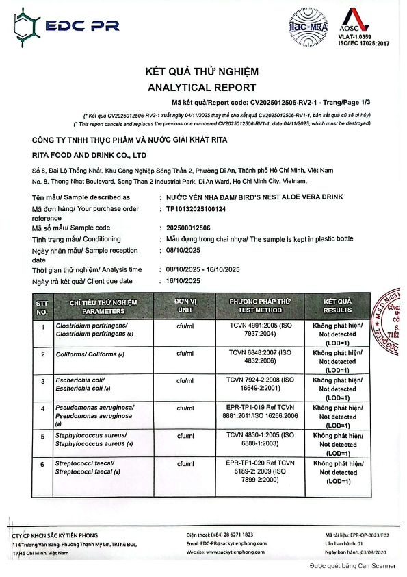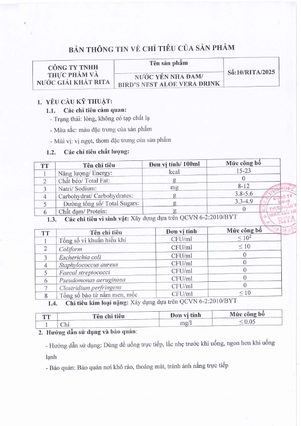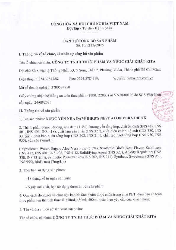 Tên sản phẩm: NƯỚC YẾN NHA ĐAM/ BIRD’S NEST ALOE VERA DRINK