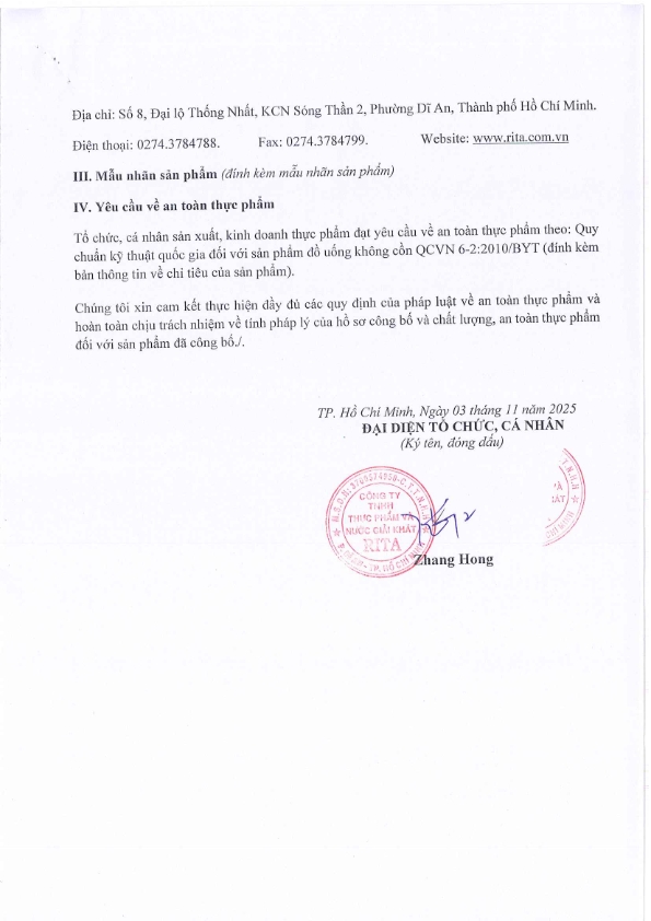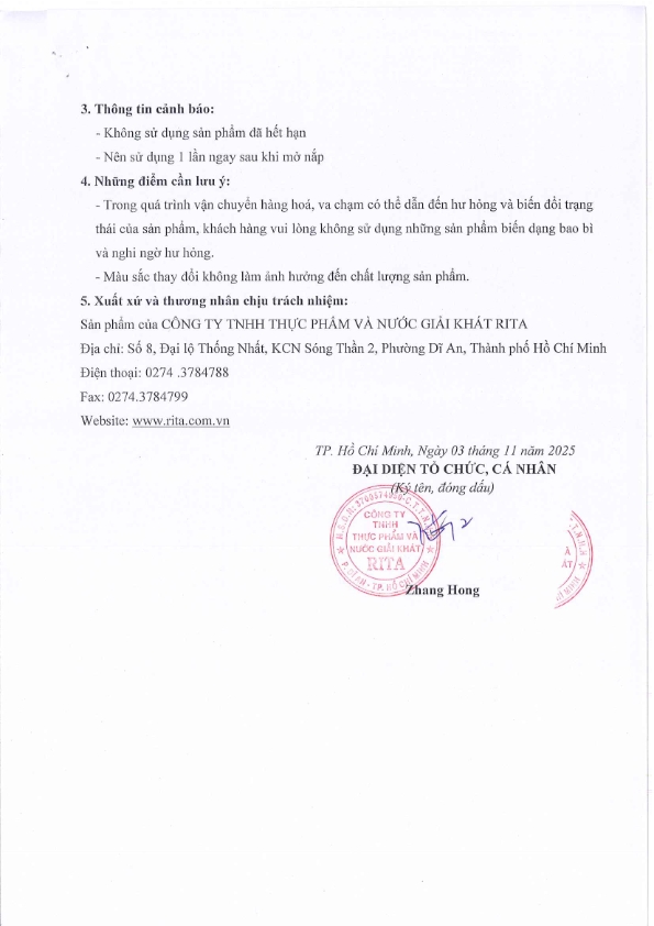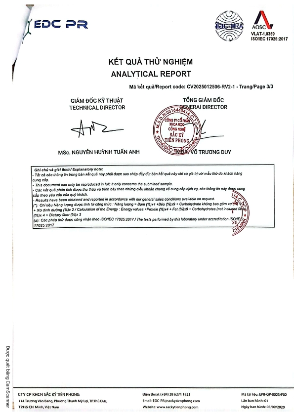 Thành phần: Nước, đường, nha đam (1.5%), hương yến tổng hợp, chất ổn định (INS 412, INS 401, INS 406, INS 418), chất làm rắn chắc (INS 327), chất điều chỉnh độ axit (INS 330, INS 331(iii)), chất bảo quản tổng hợp (INS 202, INS 211), chất tạo ngọt tổng hợp (INS 950, INS 955), yến sào (7mg/L).