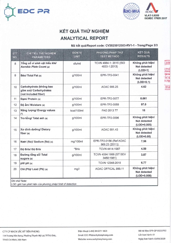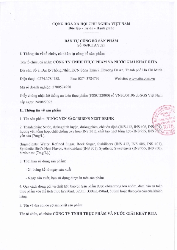 Thành phần: Nước, đường tinh luyện, đường phèn, chất ổn định (INS 412, INS 406, INS 401), ITA hương yến tổng hợp, chất chống oxy hóa (INS 301), chất tạo ngọt tổng hợp (INS 955, INS 950) yến sào (7mg/L).