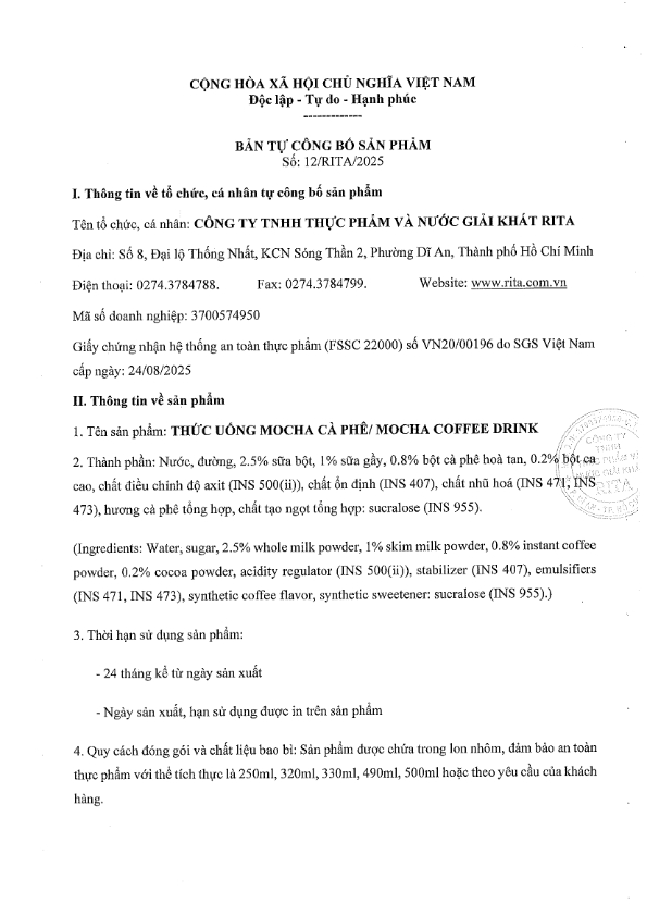 Tên sản phẩm: THỨC UỐNG MOCHA CÀ PHÊ/ MOCHA COFFEE DRINK