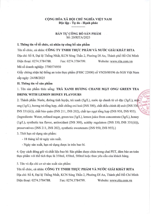 Thành phần: Nước, đường tinh luyện, trà xanh (5g/L), nước ép chanh từ cô đặc (3g/L), mật ong (1g/L), hương trà tổng hợp, chất chống oxi hoá (INS 300), chất điều chỉnh độ axit (INS 330, * NƯỚC INS 331(iii)), chất bảo quản (INS 211, INS 202), chất tạo ngọt tổng hợp (INS 950, INS 955). (Ingredients: Water, refined sugar, green tea (5g/L), lemon juice from concentrate (3g/L), honey (1g/L), synthetic tea flavor, antioxidant (INS 300), acidity regulators (INS 330, INS 331(iii)), preservatives (INS 211, INS 202), synthetic sweeteners (INS 950, INS 955).)